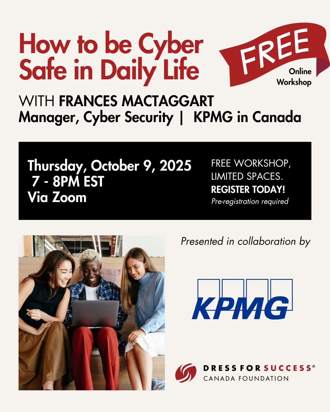 KPMG in Canada National Workshop Details (How to be Cyber Safe in Daily Life) “How to be Cyber Safe in Daily Life” Presented in collaboration with Dress for Success Canada Foundation and KPMG in Canada – Thursday, October 9, 2025 – 7pm to 8pm (Eastern Time). In collaboration with KPMG in Canada, please join us […]